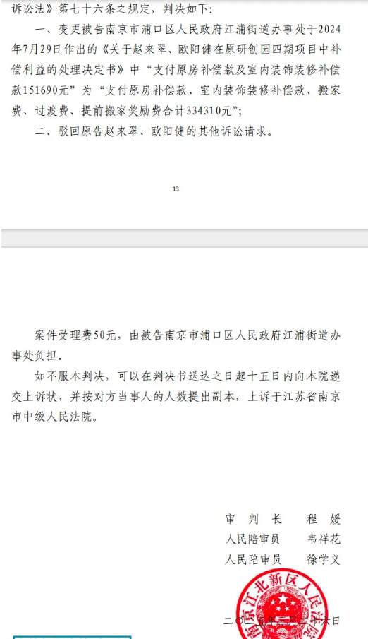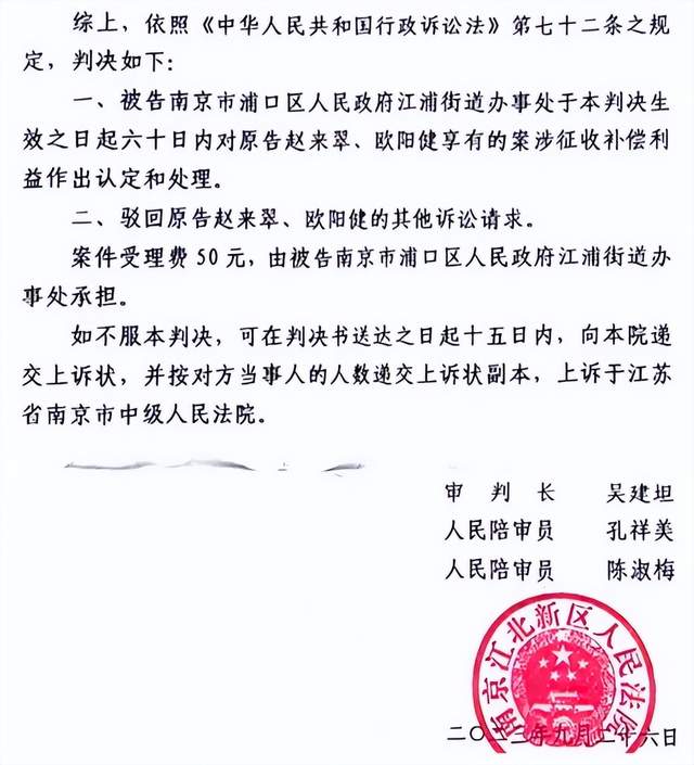 2022年,赵某翠和欧阳某向南京江北新区人民法院提起行政诉讼,要求江浦街道办履行补偿安置职责。法院在(2023)苏0192行初426号判决中认定,江浦街道办在拆除房屋后未对补偿问题作出处理,属于行政不作为,判决其限期对母子二人的补偿利益作出认定和处理。这一胜诉为后续维权奠定了基础。